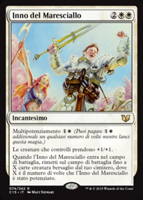 |  Variations— Parts— | Inno del MarescialloMultipotenziamento  Le creature che controlli prendono +1/+1. Quando l'Inno del Maresciallo entra nel campo di battaglia, rimetti sul campo di battaglia fino a X carte creatura bersaglio dal tuo cimitero, dove X è il numero di volte che l'Inno del Maresciallo è stato potenziato.