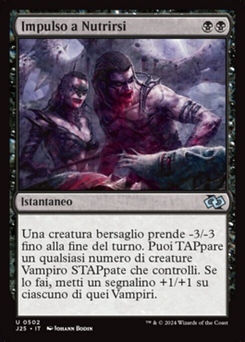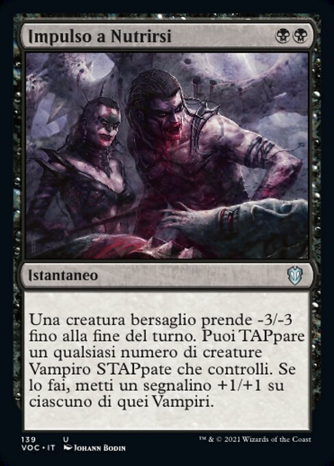![]() Variations— Parts— | Impulso a NutrirsiUna creatura bersaglio prende -3/-3 fino alla fine del turno. Puoi TAPpare un qualsiasi numero di creature Vampiro STAPpate che controlli. Se lo fai, metti un segnalino +1/+1 su ciascuno di quei Vampiri.