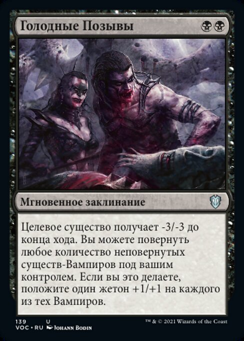 ![]() Variations— Parts— | Голодные ПозывыЦелевое существо получает -3/-3 до конца хода. Вы можете повернуть любое количество неповернутых существ-Вампиров под вашим контролем. Если вы это делаете, положите один жетон +1/+1 на каждого из тех Вампиров.