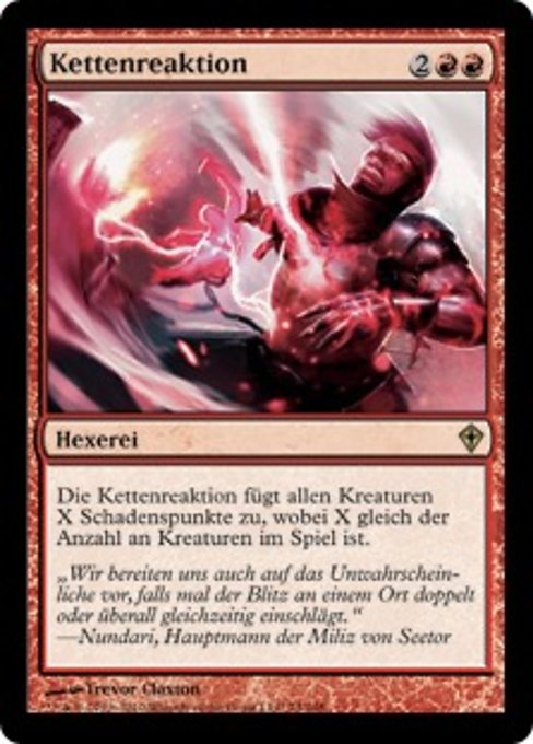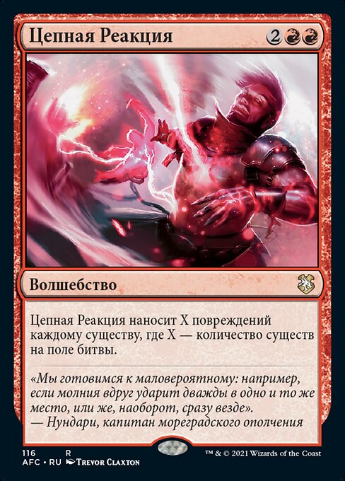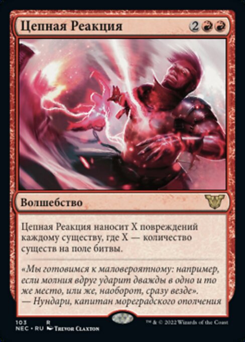 ![]() Variations— Parts— | Цепная РеакцияЦепная Реакция наносит X повреждений каждому существу, где X — количество существ на поле битвы.