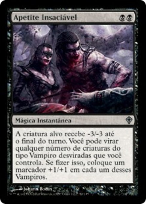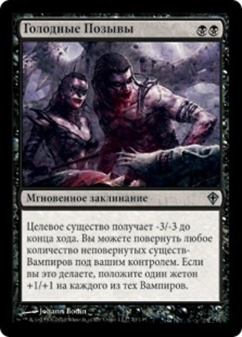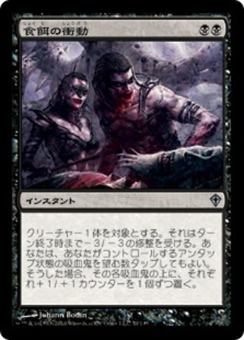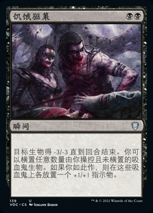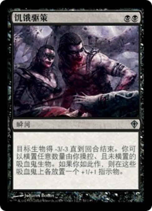 ![]() Variations— Parts— | 饥饿驱策目标生物得-3/-3直到回合结束。 你可以横置任意数量由你操控、且未横置的吸血鬼生物。 如果你如此作,则在这些吸血鬼上各放置一个+1/+1指示物。