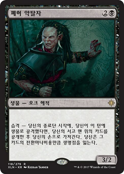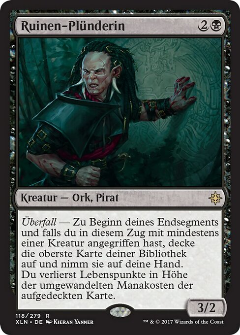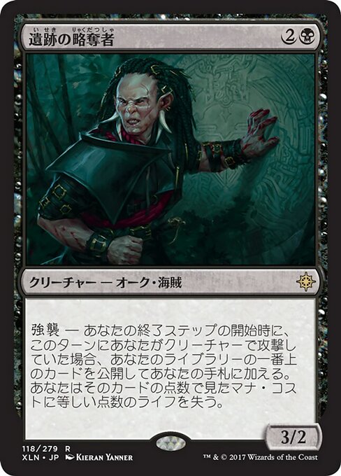 |  Variations— Parts— | Ruin Raider3 / 2 Raid — At the beginning of your end step, if you attacked this turn, reveal the top card of your library and put that card into your hand. You lose life equal to the card's mana value.