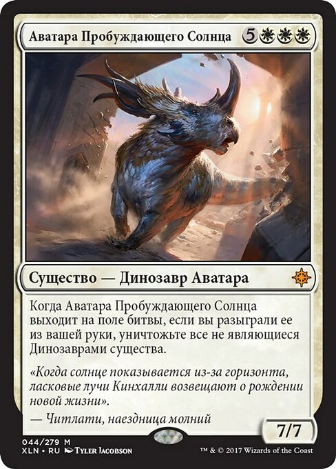 |  Variations— Parts— | Wakening Sun's Avatar7 / 7 When this creature enters, if you cast it from your hand, destroy all non-Dinosaur creatures.