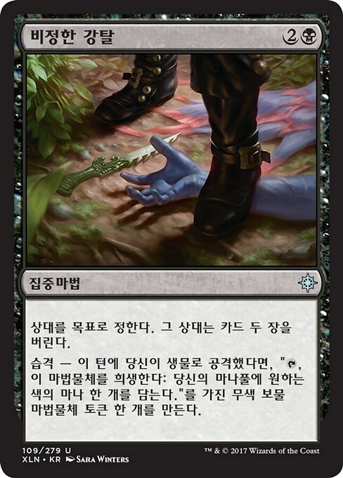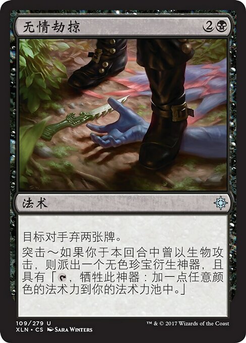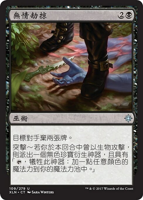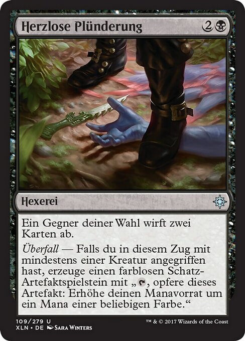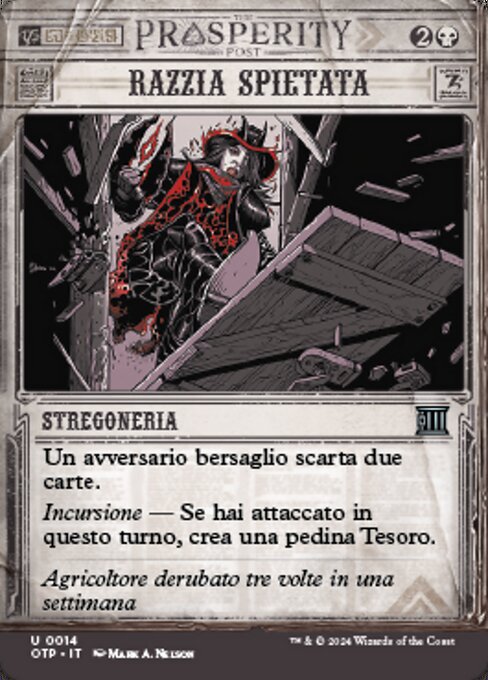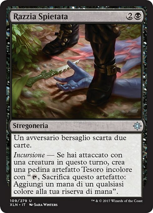 |  Variations— Parts— | Razzia SpietataUn avversario bersaglio scarta due carte. Incursione — Se hai attaccato con una creatura in questo turno, crea una pedina artefatto Tesoro incolore con "