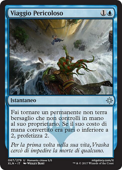 |  Variations— Parts— | Viaggio PericolosoFai tornare un permanente non terra bersaglio che non controlli in mano al suo proprietario. Se il suo costo di mana convertito era pari o inferiore a 2, profetizza 2.