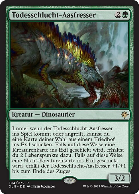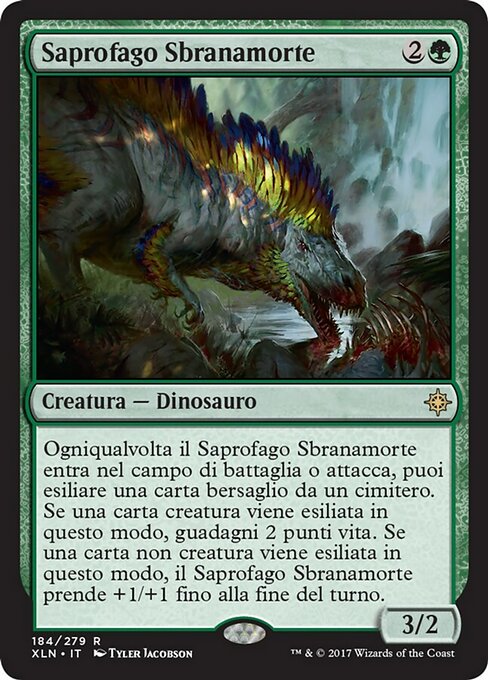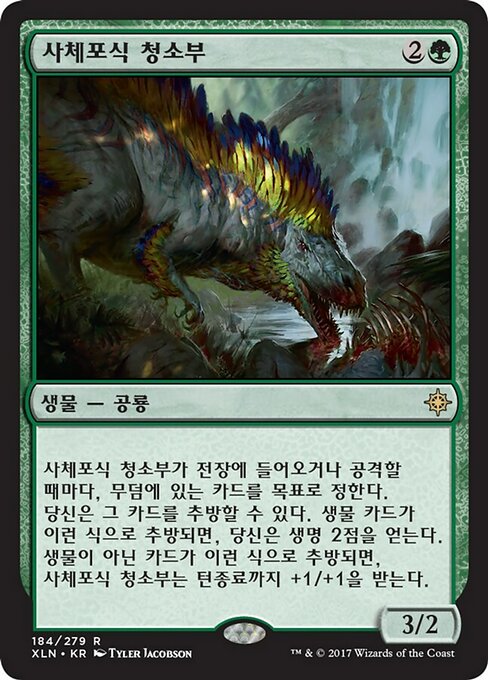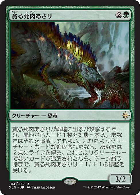 ![]() Variations— Parts— | 貪る死肉あさり3 / 2 貪る死肉あさりが戦場に出るか攻撃するたび、墓地からカード1枚を対象とする。あなたはそれを追放してもよい。これによりクリーチャー・カードが追放されたなら、あなたは2点のライフを得る。これによりクリーチャーでないカードが追放されたなら、ターン終了時まで、貪る死肉あさりは+1/+1の修整を受ける。