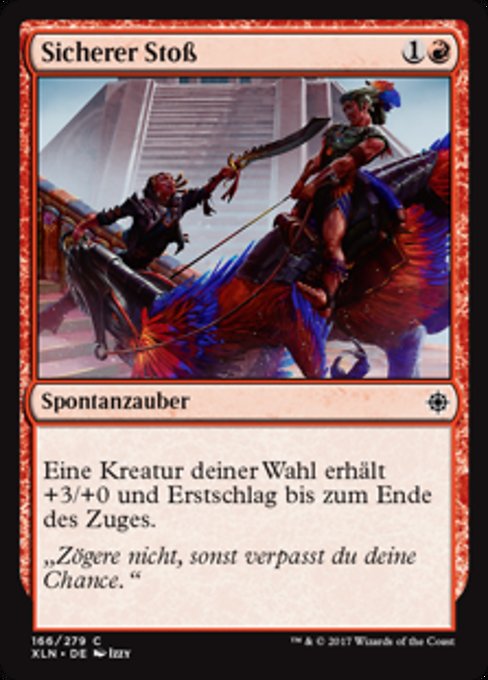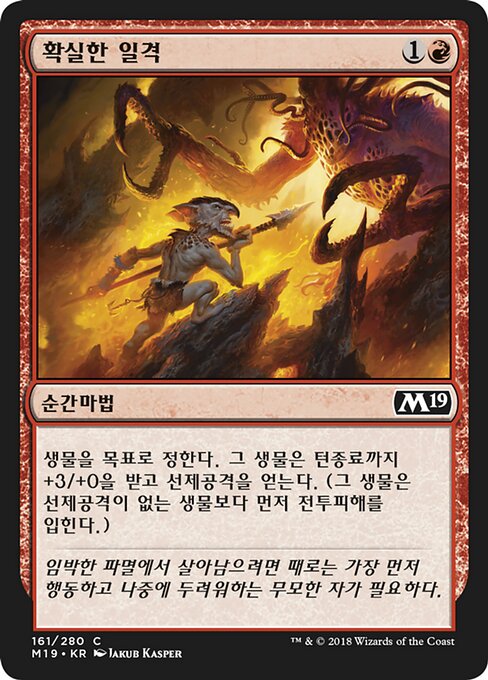 ![]() Variations— Parts— | 확실한 일격생물을 목표로 정한다. 그 생물은 턴종료까지 +3/+0을 받고 선제공격을 얻는다.