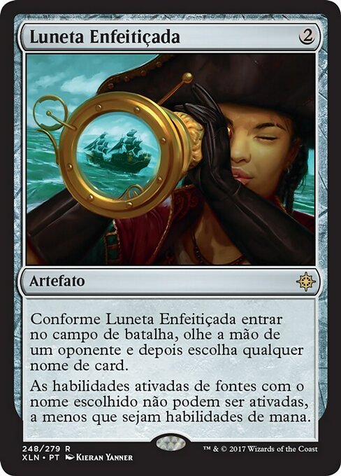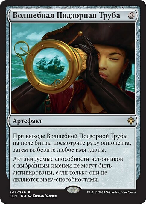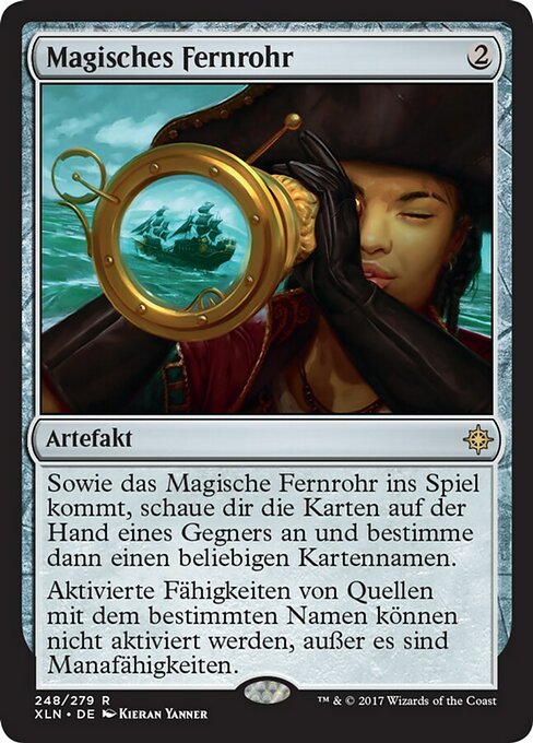 ![]() Variations— Parts— | 마법의 망원경마법의 망원경이 전장에 들어오면서, 상대의 손을 본 후, 아무 카드 이름을 선택한다. 선택한 이름을 가진 원천의 활성화능력은 마나 능력이 아닌 한 활성화될 수 없다.