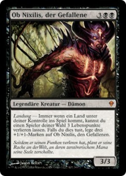 ![]() Variations— Parts— | Ob Nixilis, el caído3 / 3 Aterrizaje — Siempre que una tierra entre al campo de batalla bajo tu control, puedes hacer que el jugador objetivo pierda 3 vidas. Si lo haces, pon tres contadores +1/+1 sobre Ob Nixilis, el caído.