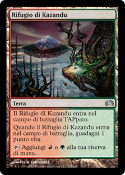 |  Variations— Parts— | Rifugio di KazanduIl Rifugio di Kazandu entra nel campo di battaglia TAPpato. Quando il Rifugio di Kazandu entra nel campo di battaglia, guadagni 1 punto vita.