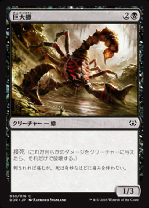 ![]() Variations— Parts— | 巨大蠍1 / 3 接死 (このクリーチャーにダメージを与えられたクリーチャーは破壊される。 このクリーチャーの戦闘ダメージは、それがブロックしている、あるいはそれをブロックしているクリーチャーの中で好きなように割り振れる。)