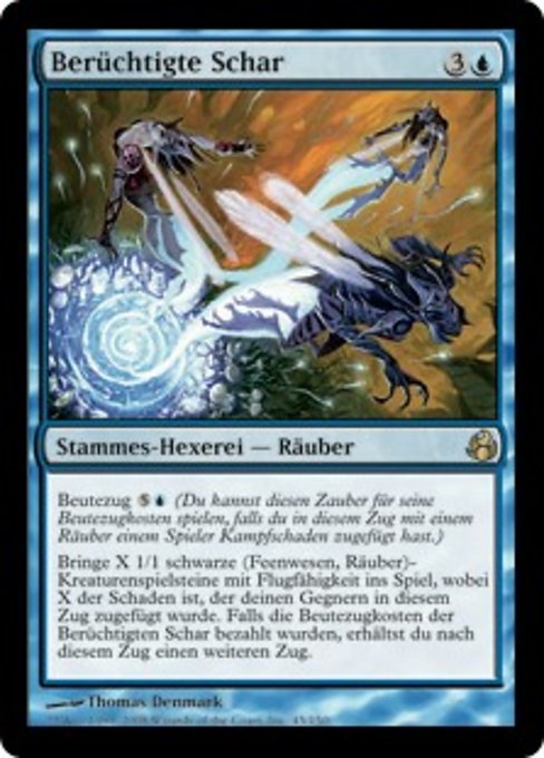 ![]() Variations— Parts— | Berüchtigte ScharBeutezug Erzeuge X 1/1 schwarze Feenwesen-Räuber-Kreaturenspielsteine mit Flugfähigkeit, wobei X gleich dem Schaden ist, der deinen Gegnern in diesem Zug zugefügt wurde. Falls die Beutezugkosten dieses Zauberspruchs bezahlt wurden, erhältst du nach diesem Zug einen zusätzlichen Zug.