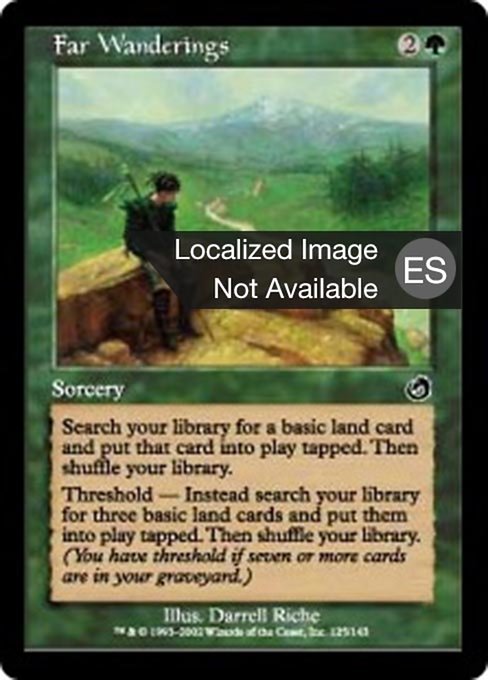 |  Variations— Parts— | Andanzas lejanasBusca en tu biblioteca una carta de tierra básica, pon esa carta en el campo de batalla girada y luego baraja tu biblioteca. Umbral — Si hay siete o más cartas en tu cementerio, en vez de eso, busca en tu biblioteca hasta tres cartas de tierra básica, ponlas en el campo de batalla giradas y luego baraja tu biblioteca.