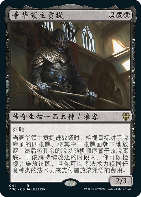 ![]() Variations— Parts— | Gonti, seigneur de l'opulence2 / 3 Contact mortel Quand Gonti, seigneur de l'opulence arrive sur le champ de bataille, regardez les quatre cartes du dessus de la bibliothèque d'un adversaire ciblé, exilez l'une d'elles face cachée, puis mettez le reste au-dessous de cette bibliothèque dans un ordre aléatoire. Vous pouvez regarder cette carte et la lancer tant qu'elle reste exilée, et vous pouvez dépenser du mana comme s'il s'agissait de mana de n'importe quel type pour lancer ce sort.