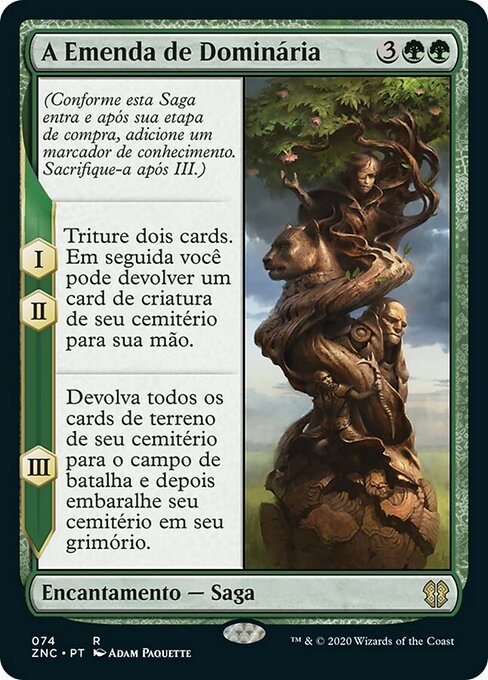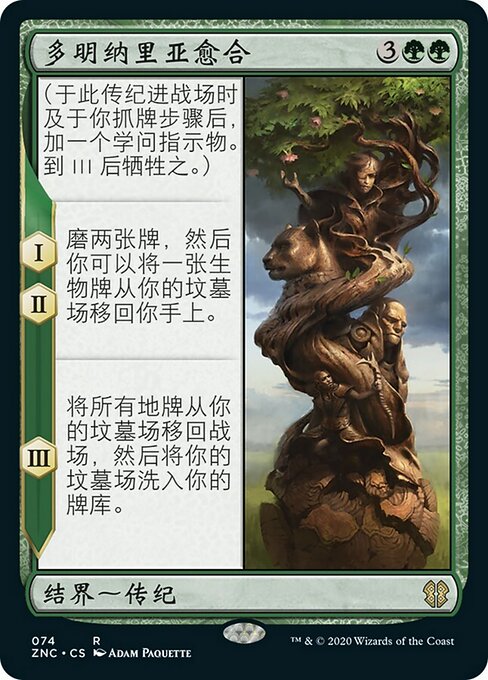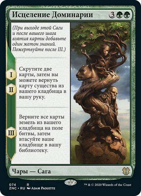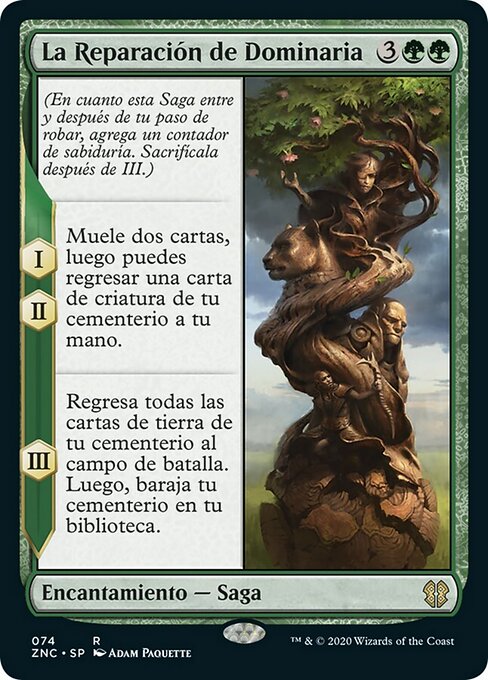 ![]() Variations— Parts— | La Restauration de Dominaria(Au moment où cette saga arrive sur le champ de bataille et après votre étape de pioche, ajoutez un marqueur « sapience ». Sacrifiez après III.) I, II — Meulez deux cartes, puis vous pouvez renvoyer une carte de créature depuis votre cimetière dans votre main. III — Renvoyez sur le champ de bataille toutes les cartes de terrain depuis votre cimetière, puis mélangez votre cimetière dans votre bibliothèque.