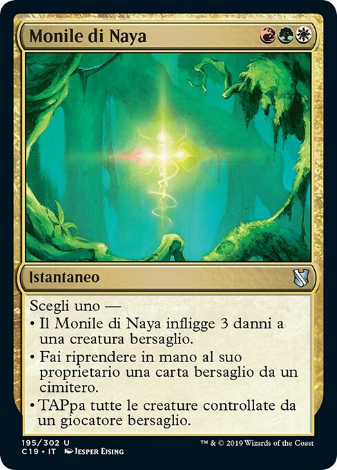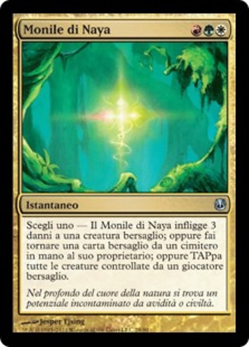 |  Variations— Parts— | Monile di NayaScegli uno — • Il Monile di Naya infligge 3 danni a una creatura bersaglio. • Fai riprendere in mano al suo proprietario una carta bersaglio da un cimitero. • TAPpa tutte le creature controllate da un giocatore bersaglio.