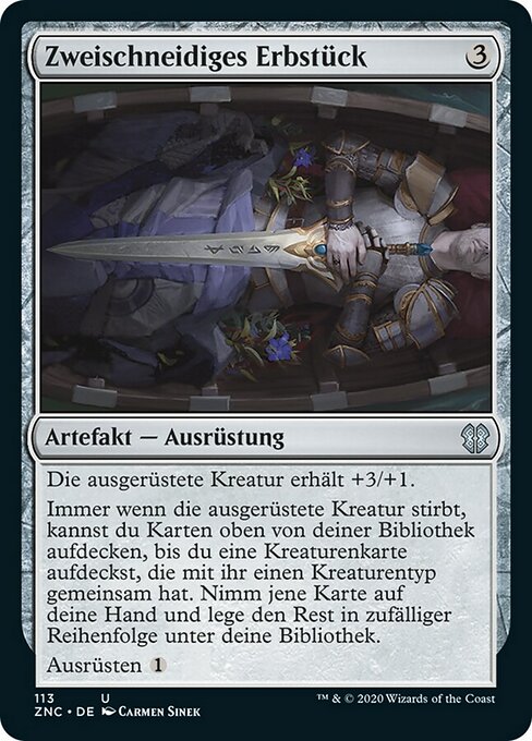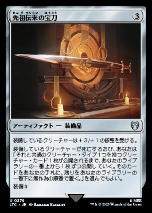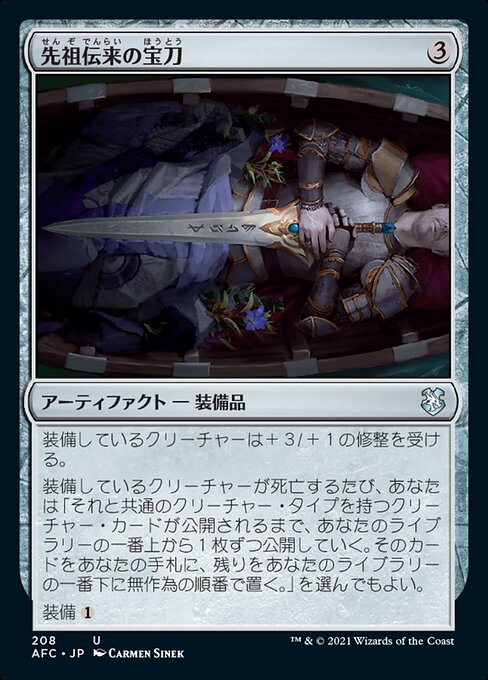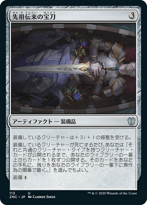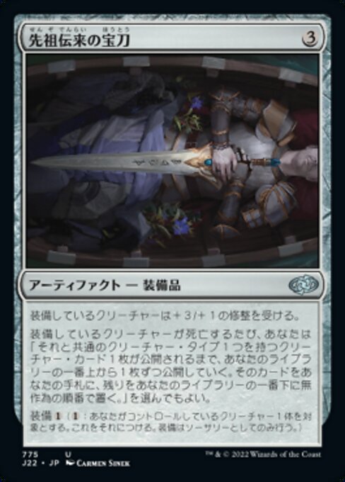 ![]() Variations— Parts— | 先祖伝来の宝刀装備しているクリーチャーは+3/+1の修整を受ける。 装備しているクリーチャーが死亡するたび、あなたは「それと共通のクリーチャー・タイプを持つクリーチャー・カードが公開されるまで、あなたのライブラリーの一番上からカードを1枚ずつ公開する。そのカードをあなたの手札に、残りをあなたのライブラリーの一番下に無作為の順番で置く。」を選んでもよい。 装備