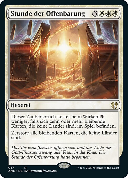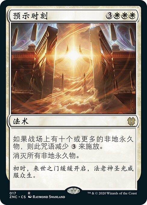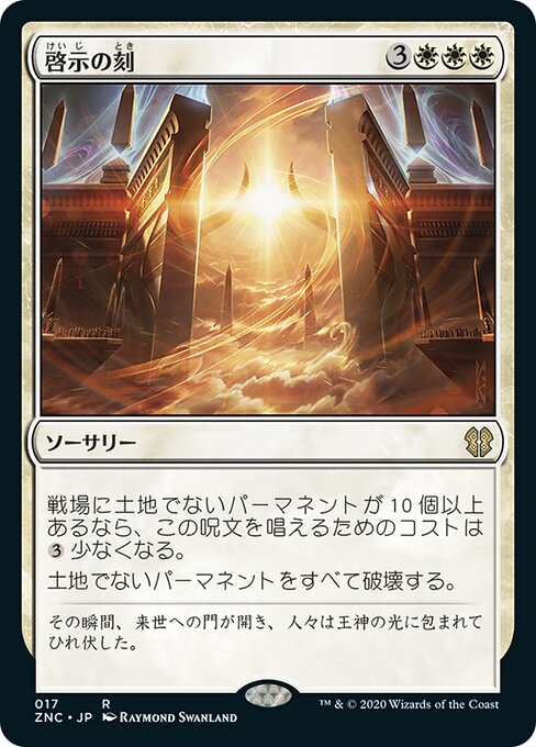 ![]() Variations— Parts— | 啓示の刻戦場に土地でないパーマネントが10個以上あるなら、この呪文を唱えるためのコストは 土地でないパーマネントをすべて破壊する。