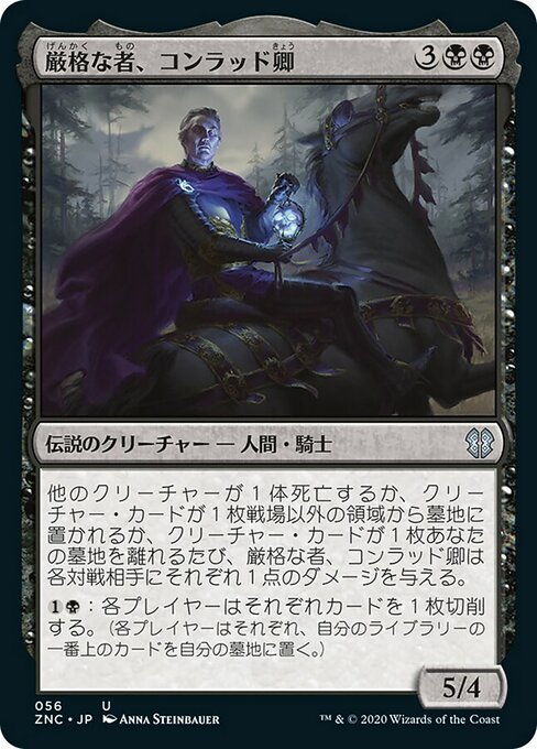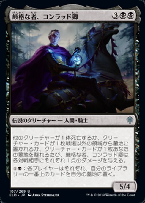 ![]() Variations— Parts— | 厳格な者、コンラッド卿5 / 4 他のクリーチャーが1体死亡するか、クリーチャー・カードが1枚戦場以外の領域から墓地に置かれるか、クリーチャー・カードが1枚あなたの墓地を離れるたび、厳格な者、コンラッド卿は各対戦相手にそれぞれ1点のダメージを与える。
