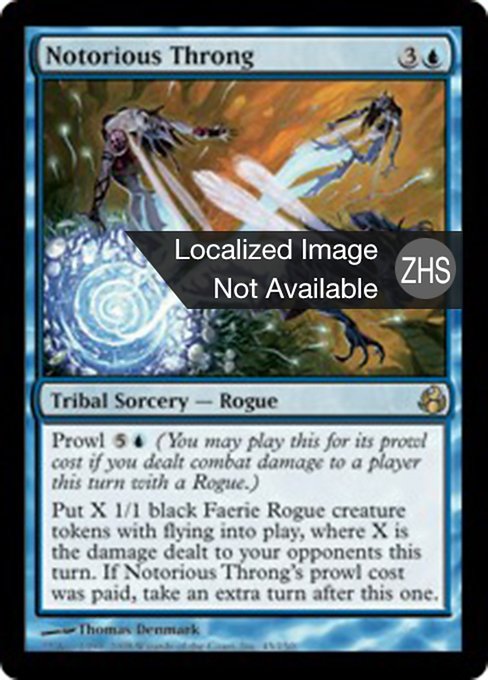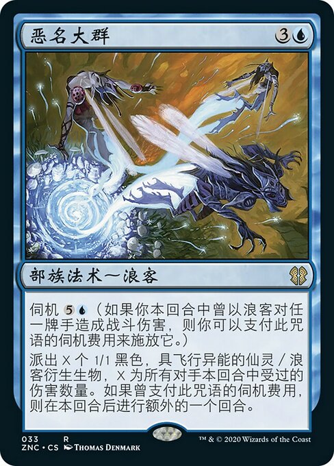 ![]() Variations— Parts— | 恶名大群伺机 派出X个1/1黑色,具飞行异能的仙灵/浪客衍生生物,X为所有对手本回合中受过的伤害数量。如果曾支付此咒语的伺机费用,则在本回合后进行额外的一个回合。