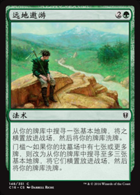 |  Variations— Parts— | 远地遨游从你的牌库中搜寻一张基本地牌,将该牌横置放进战场,然后将你的牌库洗牌。 门槛~如果你的坟墓场中有七张或更多牌,则改为从你的牌库中搜寻至多三张基本地牌,将它们横置放进战场,然后将你的牌库洗牌。