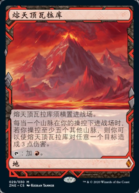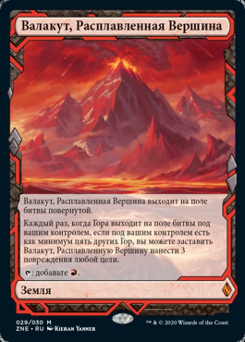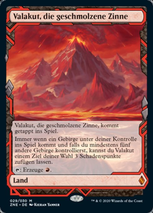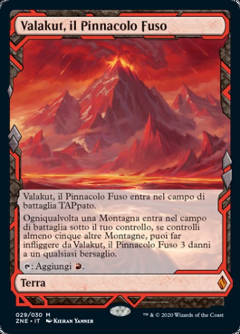 ![]() Variations— Parts— | Valakut, the Molten PinnacleThis land enters tapped. Whenever a Mountain you control enters, if you control at least five other Mountains, you may have this land deal 3 damage to any target.