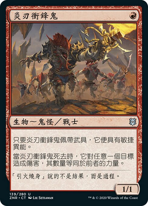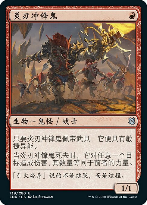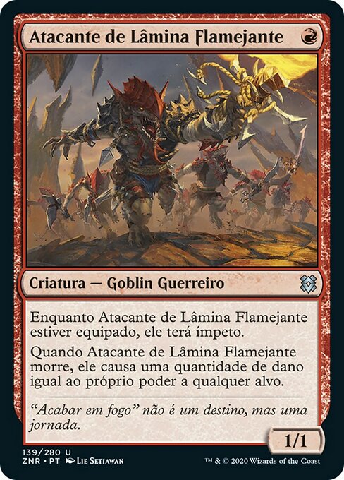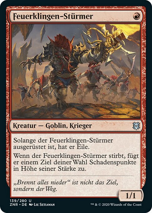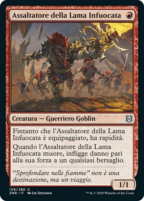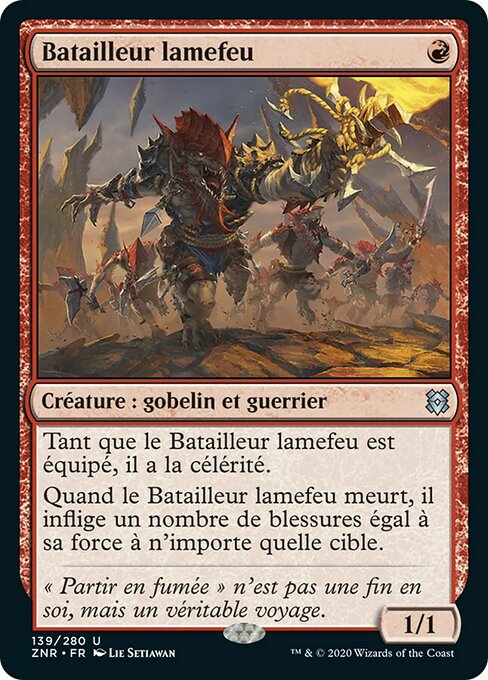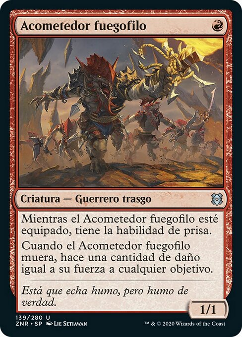 ![]() Variations— Parts— | Fireblade Charger1 / 1 As long as this creature is equipped, it has haste. When this creature dies, it deals damage equal to its power to any target.