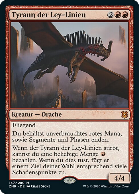 ![]() Variations : 1Parts— | Leyline Tyrant4 / 4 Flying You don't lose unspent red mana as steps and phases end. When this creature dies, you may pay any amount of