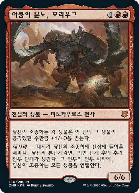 ![]() Variations : 1Parts— | Moraug, Fury of Akoum6 / 6 Each creature you control gets +1/+0 for each time it has attacked this turn. Landfall — Whenever a land you control enters, if it's your main phase, there's an additional combat phase after this phase. At the beginning of that combat, untap all creatures you control.