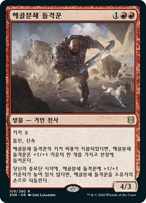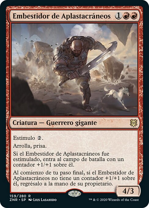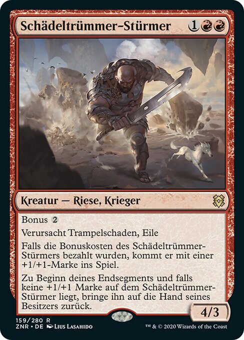 ![]() Variations : 1Parts— | Shatterskull Charger4 / 3 Kicker Trample, haste If this creature was kicked, it enters with a +1/+1 counter on it. At the beginning of your end step, if this creature doesn't have a +1/+1 counter on it, return it to its owner's hand.