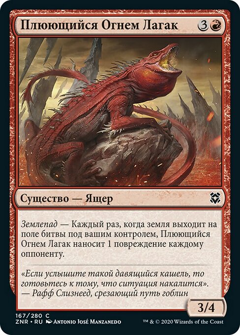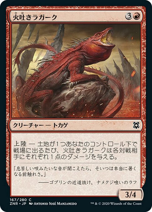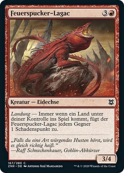 ![]() Variations : 1Parts— | Spitfire Lagac3 / 4 Landfall — Whenever a land you control enters, this creature deals 1 damage to each opponent.