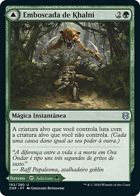 ![]() Variations— Parts—  | Khalni AmbushTarget creature you control fights target creature you don't control. (Each deals damage equal to its power to the other.)