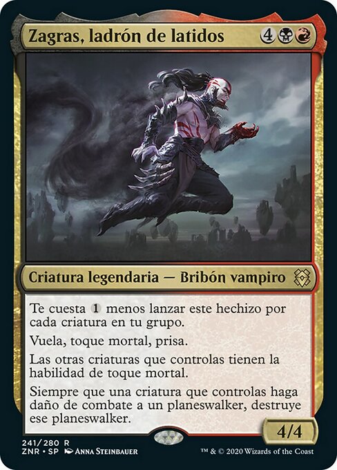 ![]() Variations : 1Parts—  | Zagras, Thief of Heartbeats4 / 4 This spell costs  Flying, deathtouch, haste Other creatures you control have deathtouch. Whenever a creature you control deals combat damage to a planeswalker, destroy that planeswalker.