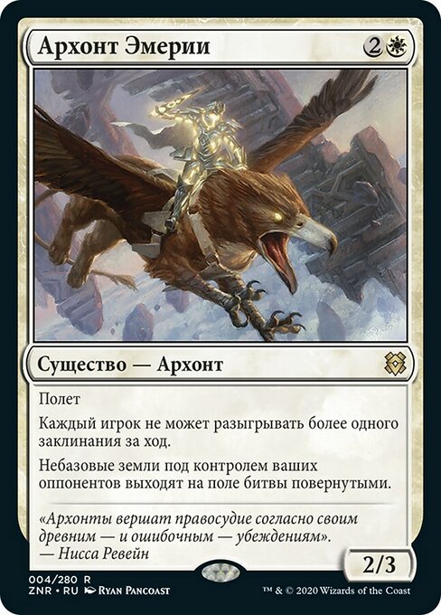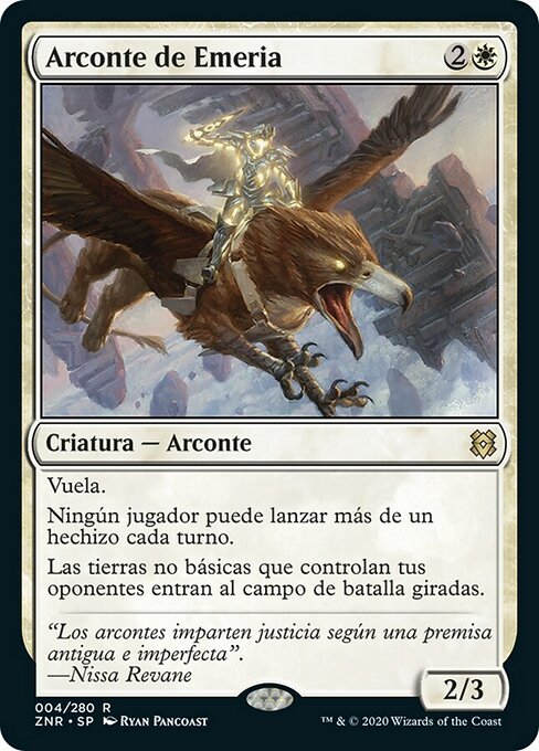 ![]() Variations : 1Parts— | Archon of Emeria2 / 3 Flying Each player can't cast more than one spell each turn. Nonbasic lands your opponents control enter tapped.
