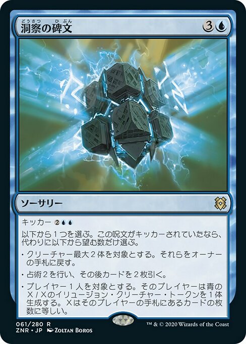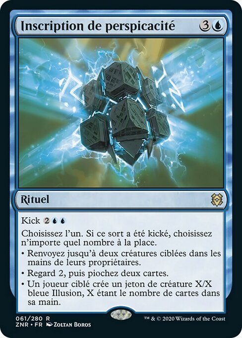 ![]() Variations : 1Parts : 2 | Inscription of InsightKicker Choose one. If this spell was kicked, choose any number instead. • Return up to two target creatures to their owners' hands. • Scry 2, then draw two cards. • Target player creates an X/X blue Illusion creature token, where X is the number of cards in their hand.