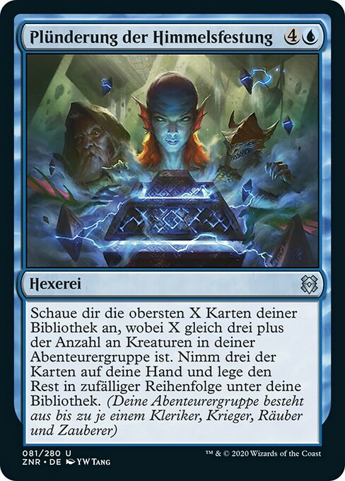 ![]() Variations— Parts— | Skyclave PlunderLook at the top X cards of your library, where X is three plus the number of creatures in your party. Put three of those cards into your hand and the rest on the bottom of your library in a random order. (Your party consists of up to one each of Cleric, Rogue, Warrior, and Wizard.)