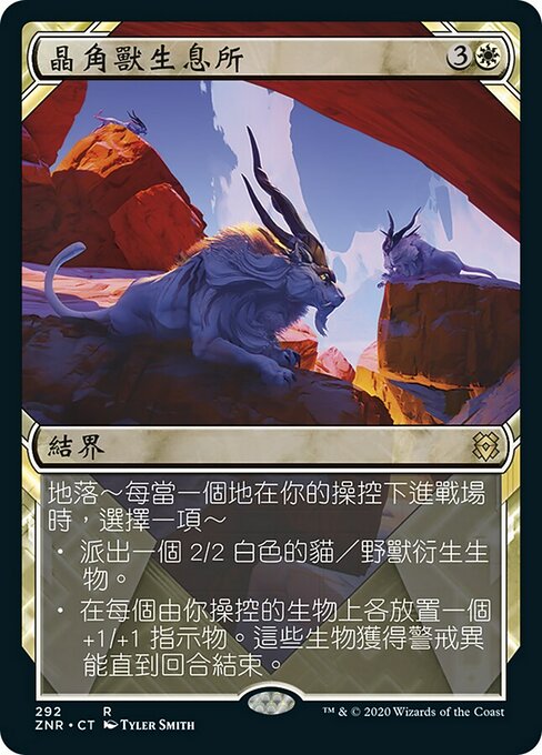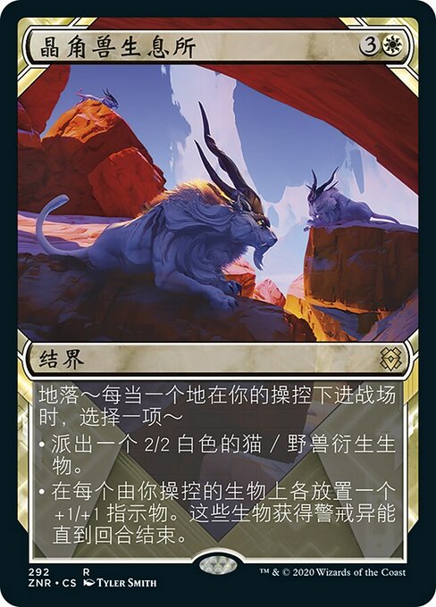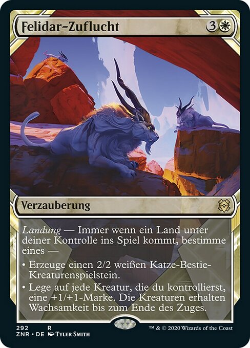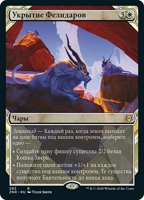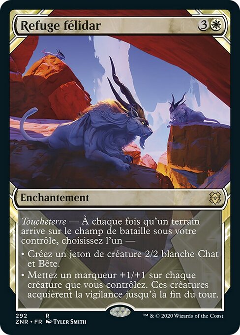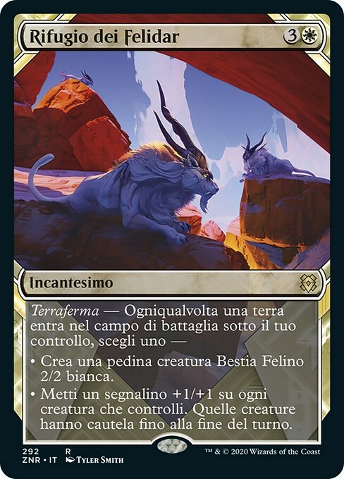 ![]() Variations : 1Parts— | Rifugio dei FelidarTerraferma — Ogniqualvolta una terra entra nel campo di battaglia sotto il tuo controllo, scegli uno — • Crea una pedina creatura Bestia Felino 2/2 bianca. • Metti un segnalino +1/+1 su ogni creatura che controlli. Quelle creature hanno cautela fino alla fine del turno.