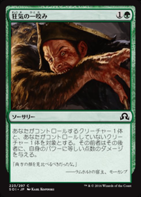 |  Variations— Parts— | 狂気の一咬みあなたがコントロールしているクリーチャー1体と、あなたがコントロールしていないクリーチャー1体を対象とする。その前者はその後者に、自身のパワーに等しい点数のダメージを与える。