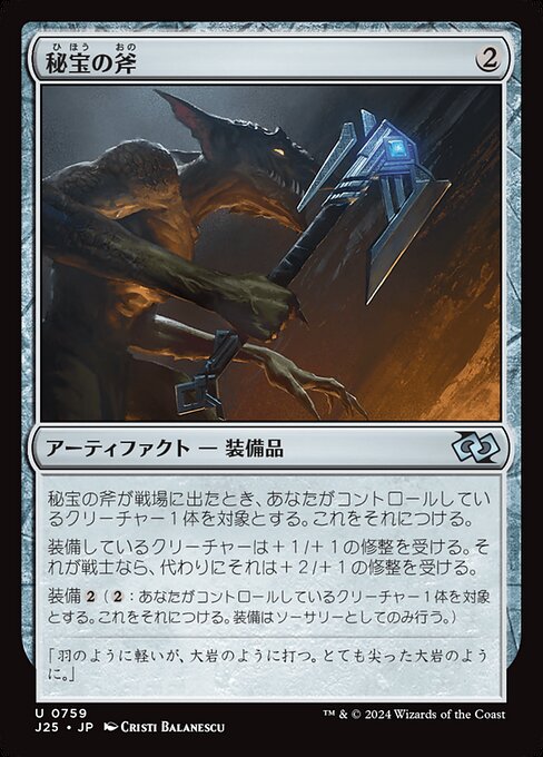 ![]() Variations— Parts— | 秘宝の斧秘宝の斧が戦場に出たとき、あなたがコントロールしているクリーチャー1体を対象とする。これをそれにつける。 装備しているクリーチャーは+1/+1の修整を受ける。それが戦士であるなら、代わりにそれは+2/+1の修整を受ける。 装備